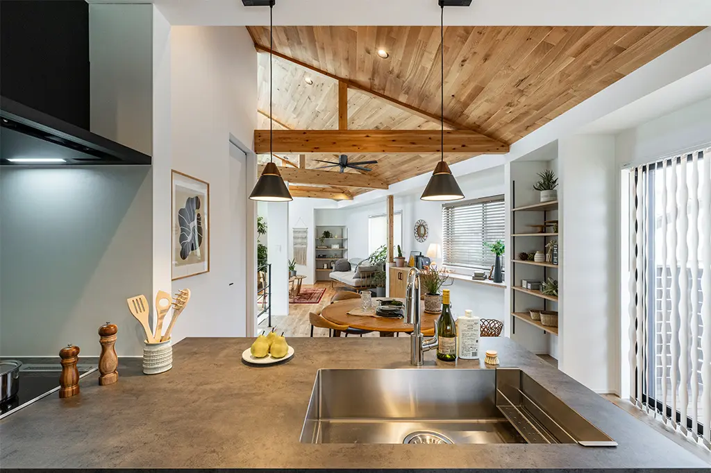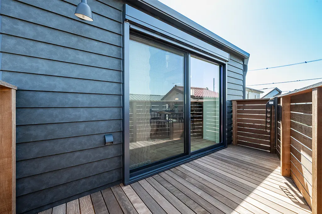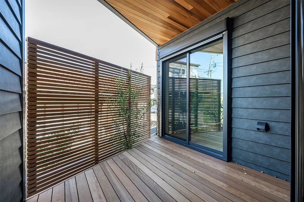 2階リビングに敷地北側の高低差を利用したウッドデッキを設置