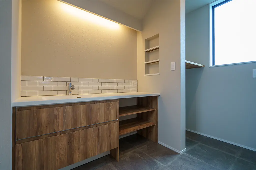 外壁 / 東レ:窯変ラップサイディング 玄関ドア / 断熱ドア サッシ / 防火仕様 樹脂複合サッシ アイランドキッチン / TOTOミッテ(造作腰壁・水ホウキ水栓・センターフード・食洗機・コンセント) 洗面化粧台 / オリジナルの造作洗面台 内装建具 / 天井迄のハイドア 階段・手すり / 片側鉄骨筅:スケルトン階段・タモ材 玄関ホール他天井 / 無垢板張り部分有 洗面・トイレ / 耐水性の有るフロアタイル使用 玄関ホール・廊下・LDK床 / 無垢オーク材 |