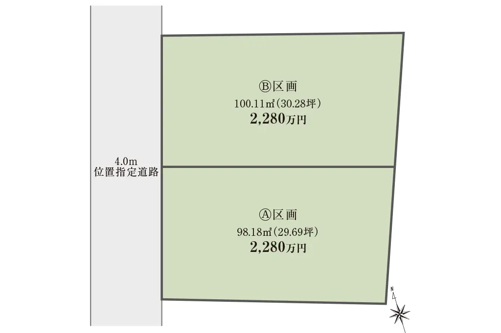 | 土地面積 | Ⓐ区画98.18㎡(29.69坪)、Ⓑ区画100.11㎡(30.28坪) |